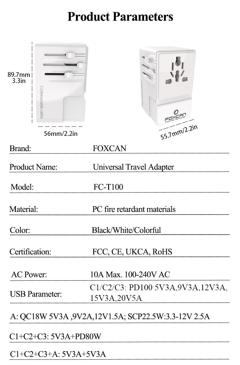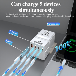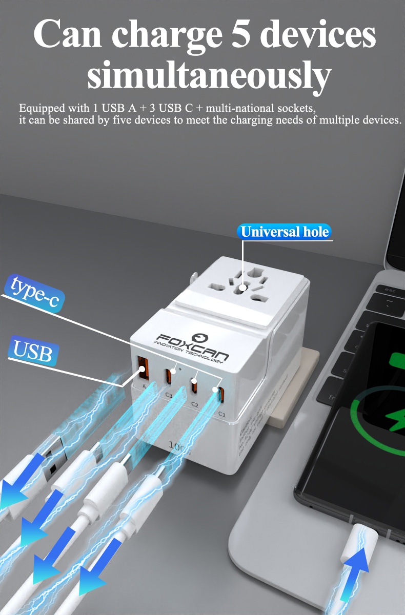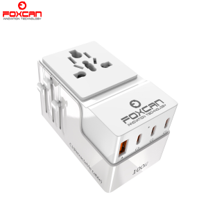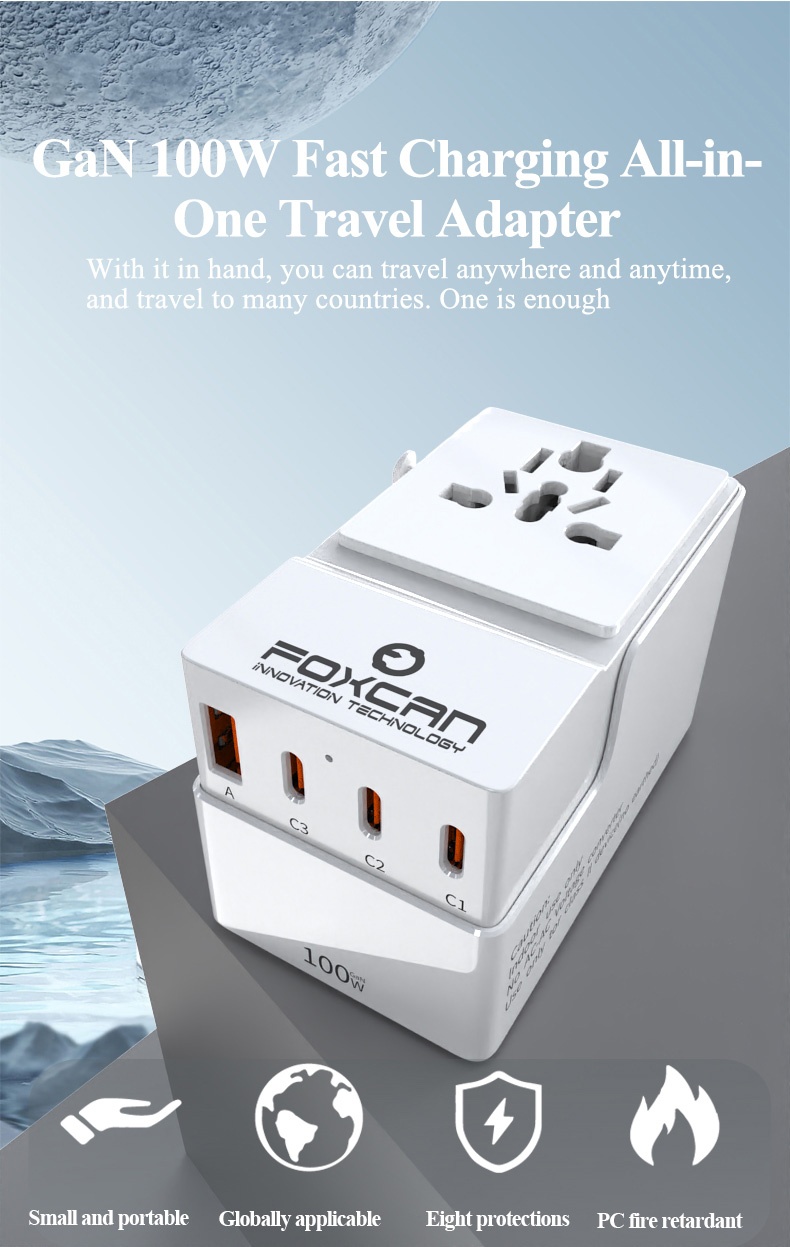 • Name:FOXCAN-T100 GaN PD100W Universal Travel Adapter with 2USB-C+2USB-A Charger US Europe Australia Britain Plug Adapter
